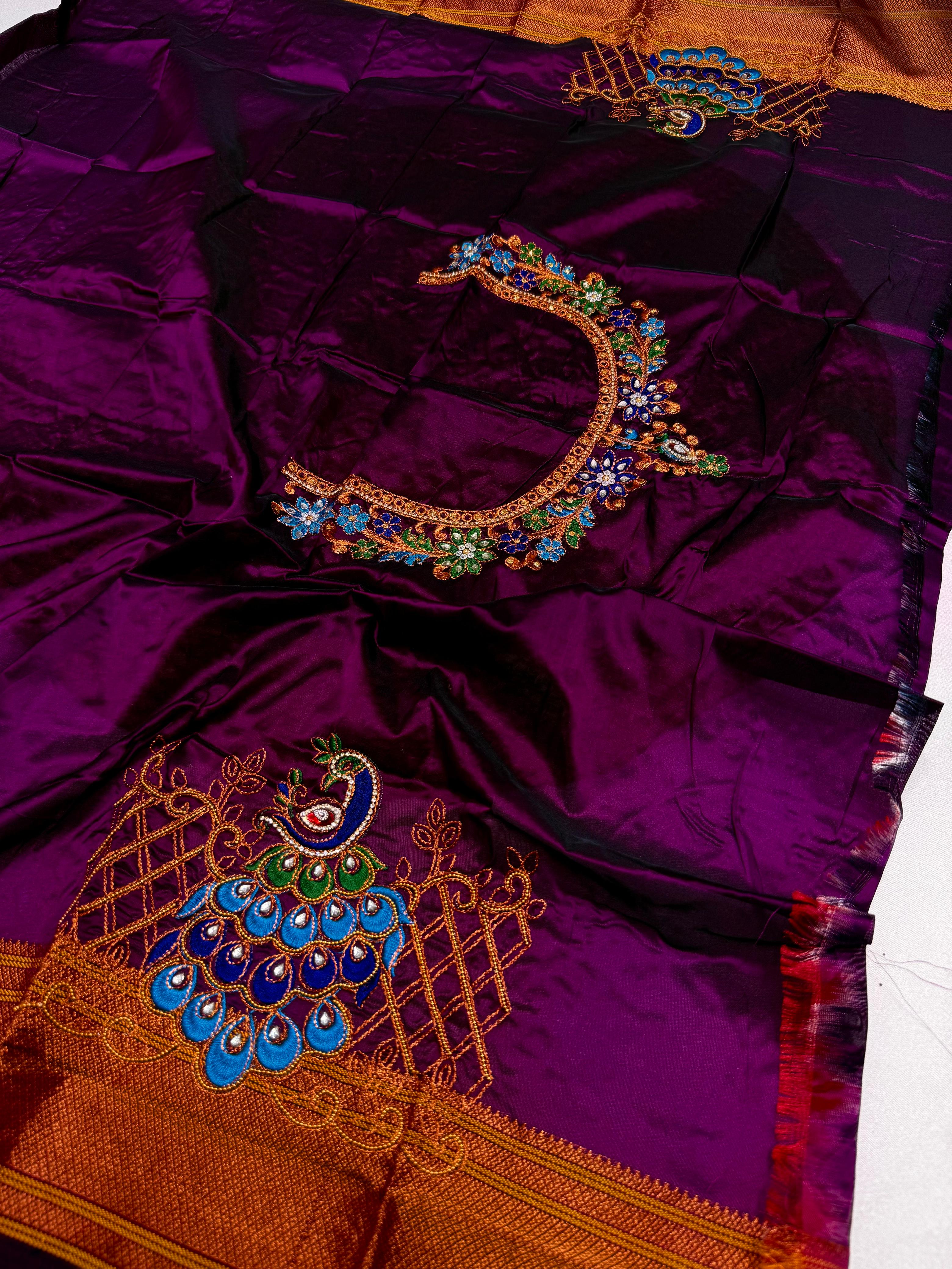 The highlight of this drape is its 4x1 majestic peacock pallu paired with a handwork embroidery blouse piece, adding unmatched elegance and grandeur. Available in royal and festive shades like Royal Blue, Dark Green, Mehendi Green, Olive Green, Teal, Purple, and Rani, this saree is the perfect choice for weddings, festivals, and special occasions.