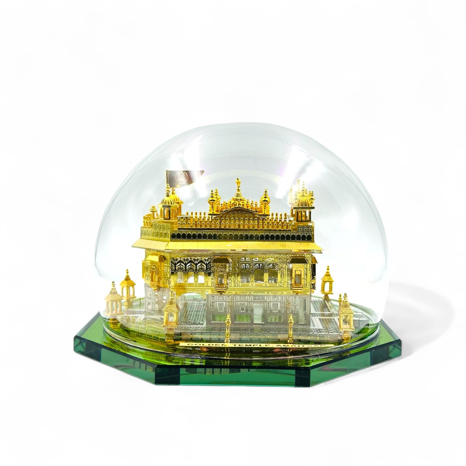 Details: Add a touch of elegance and spirituality to your space with this 24K gold-plated miniature replica of the iconic Golden Temple (Harmandir Sahib). Carefully enclosed in a pristine glass dome, this showpiece boasts exquisite detailing and a radiant gold finish, making it a perfect addition to home decor, office spaces, or a thoughtful gift. Whether as a centerpiece in your living room or a symbol of faith and heritage on your desk, this premium collectible showcases timeless craftsmanship.