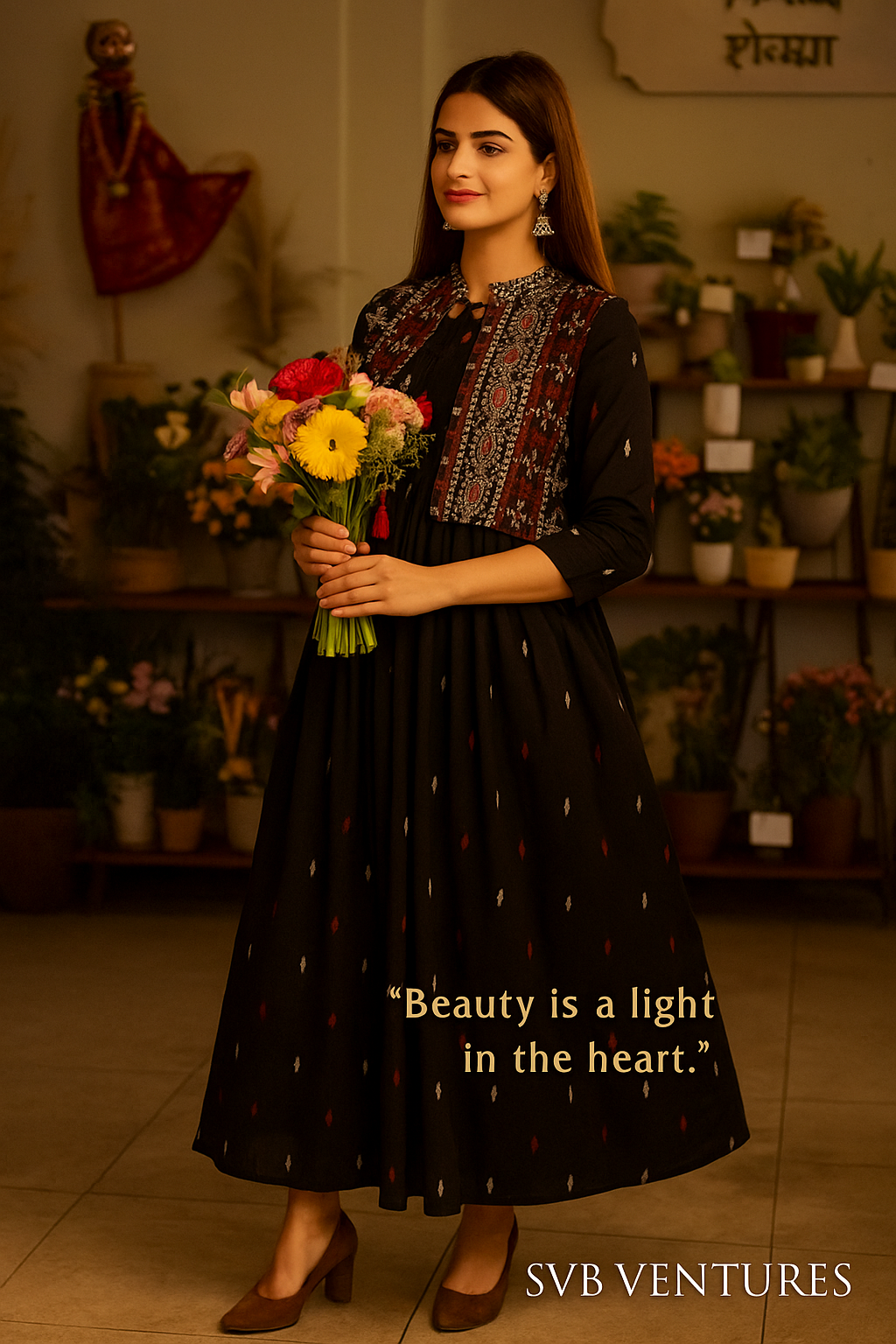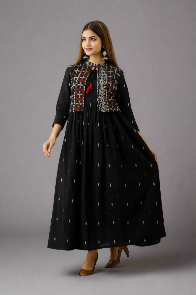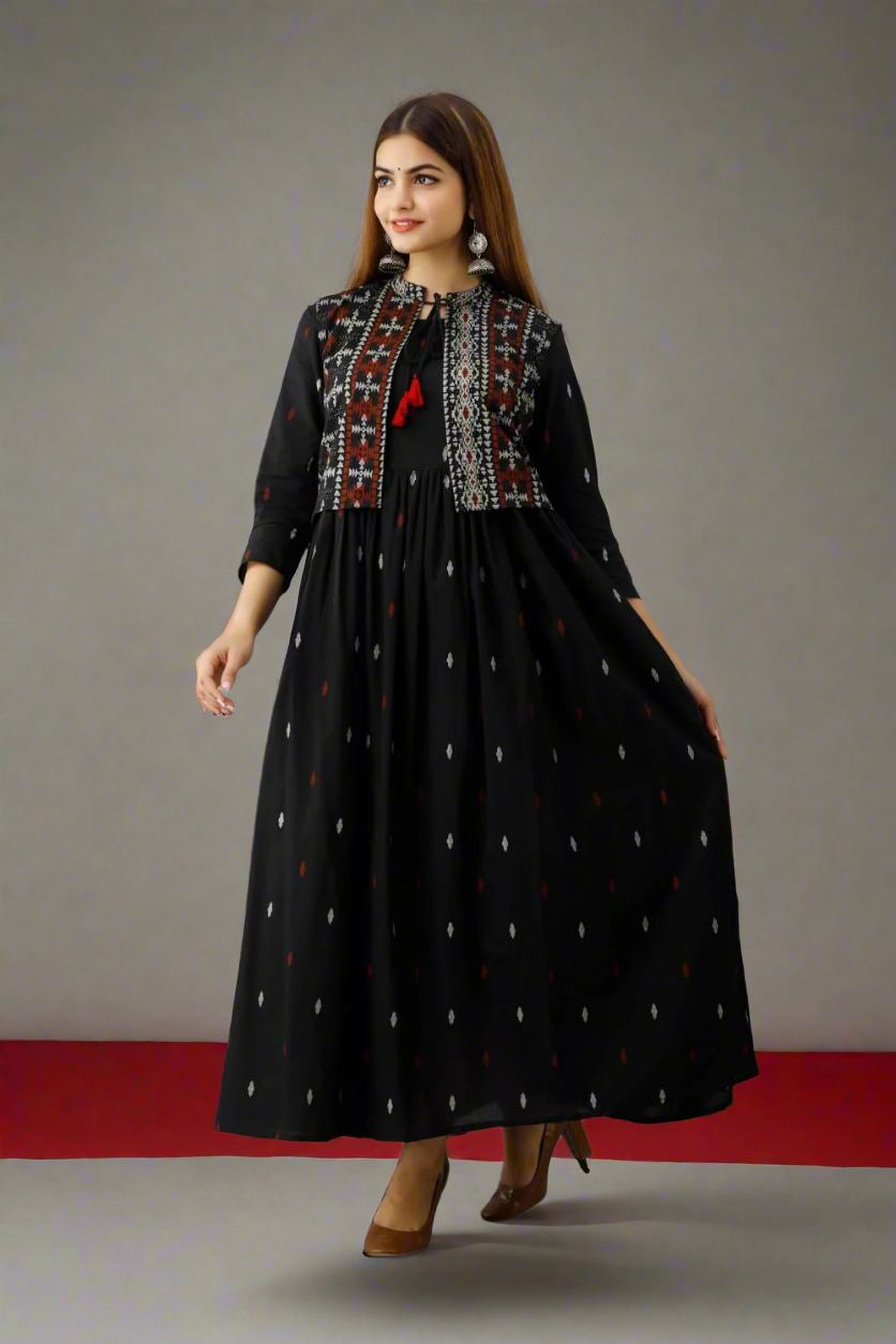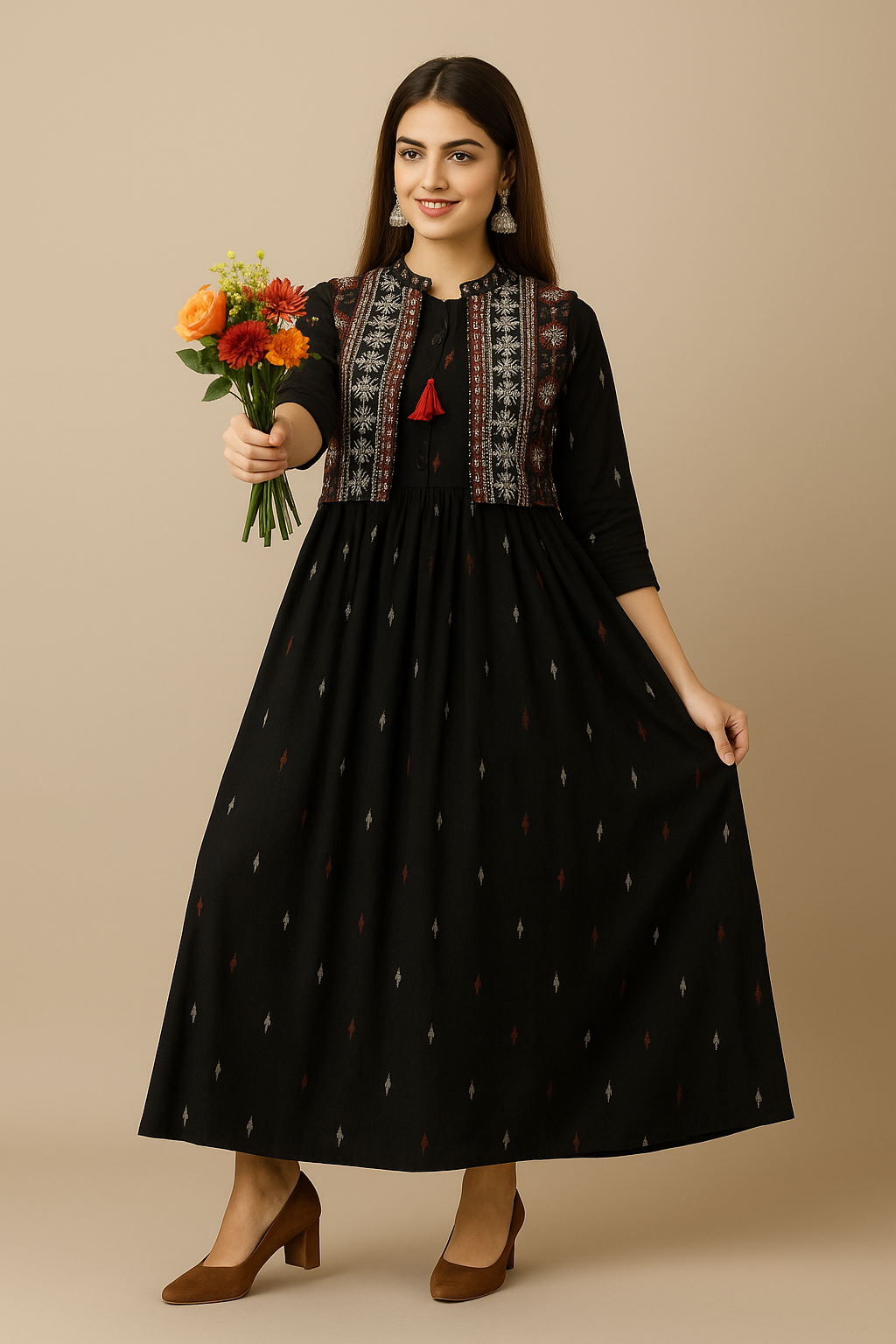 This elegant women's long gown kurti in black is crafted from breathable cotton, ensuring comfort and style. It features a matching jacket that adds a sophisticated layer, perfect for formal occasions or festive events. The combination of traditional design with contemporary tailoring offers a versatile outfit that enhances your wardrobe with both grace and practicality. Ideal for those seeking a refined yet comfortable ensemble.
