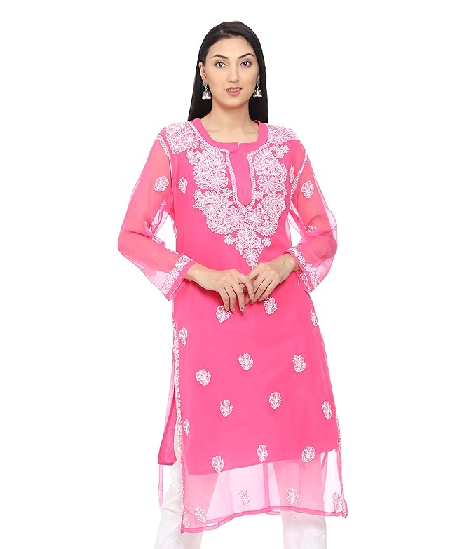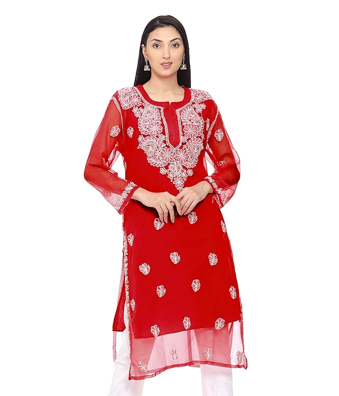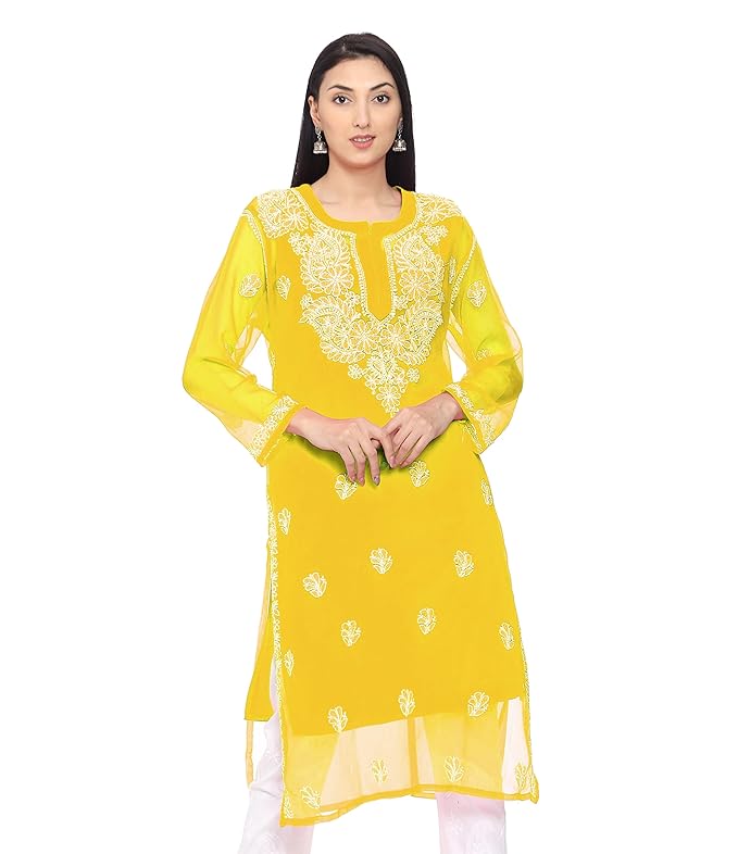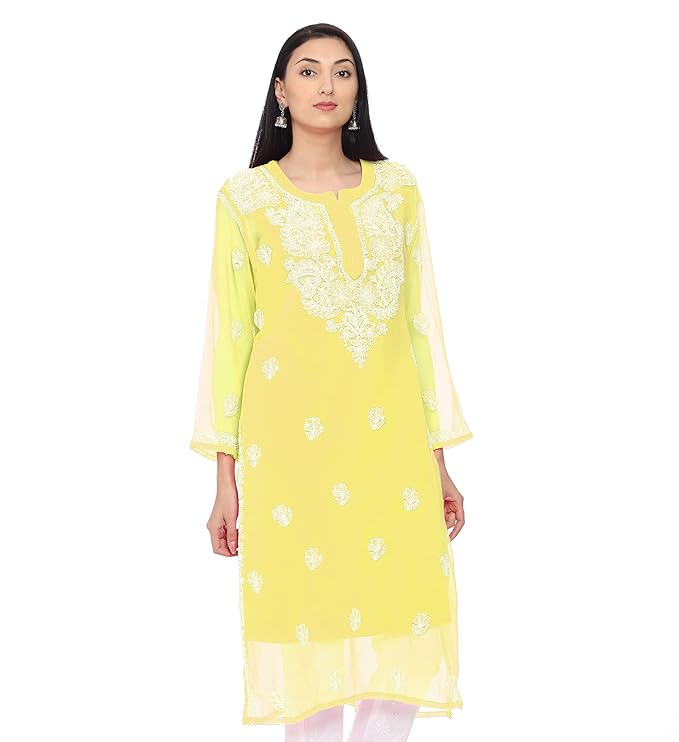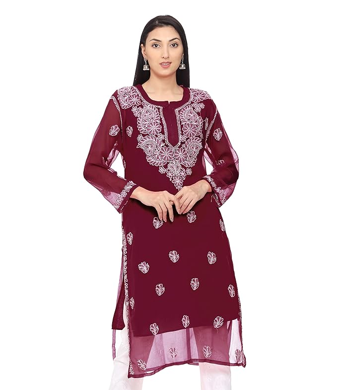 - Lucknowi Chikankari Chiffon Kurti having Embroidery around neck and Small Bootis throughout front