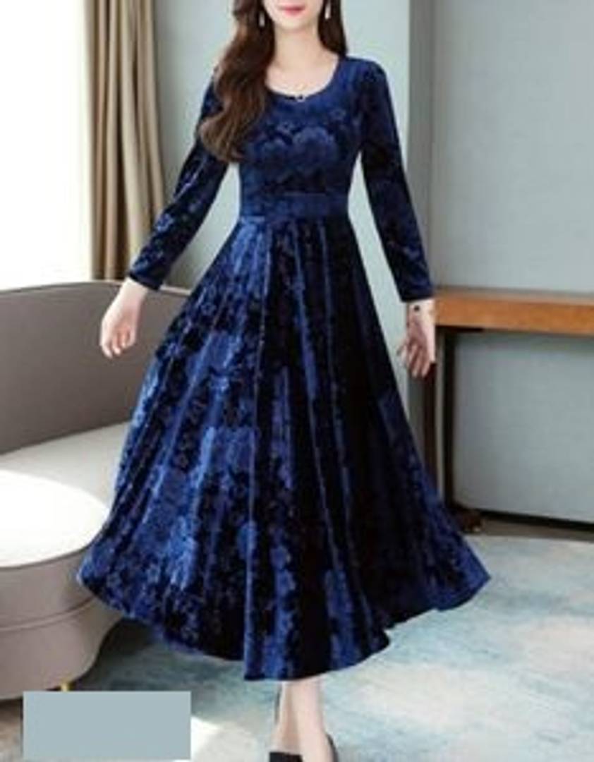 This navy blue printed velvet long dress offers both style and comfort. The self pattern adds a unique touch to the classic navy blue color, making it a perfect choice for any occasion. The soft velvet fabric ensures a comfortable fit and adds a touch of elegance to your wardrobe.