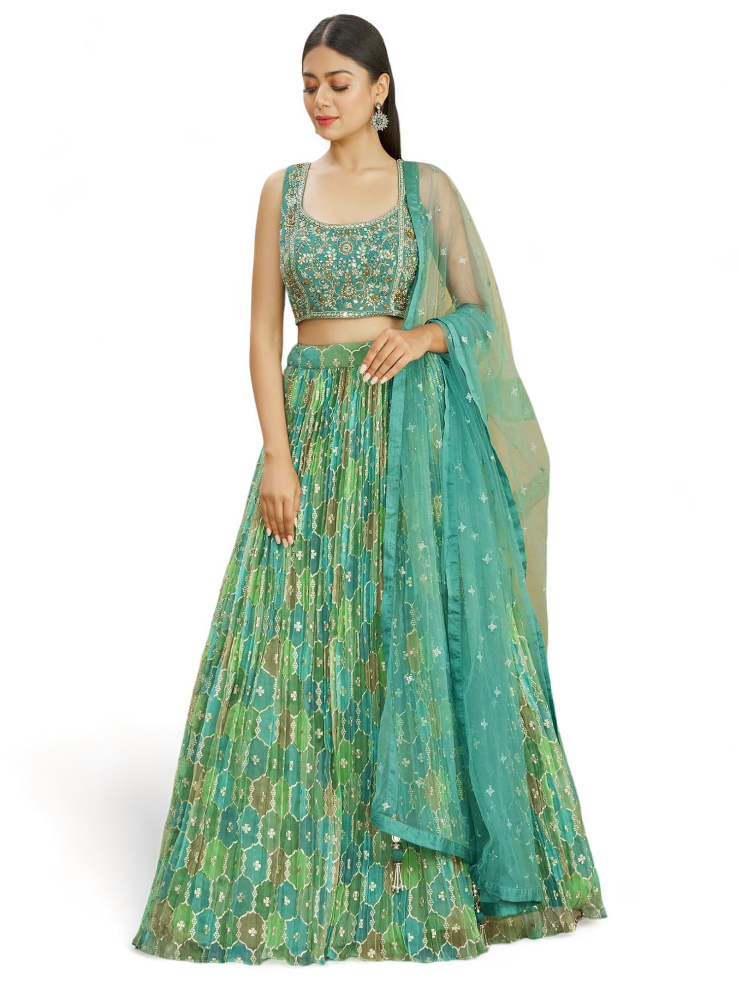 Women's Chinon Silk Embroidered Mirror Work Semi-Stitched Lehenga Choli With Dupatta Green free size