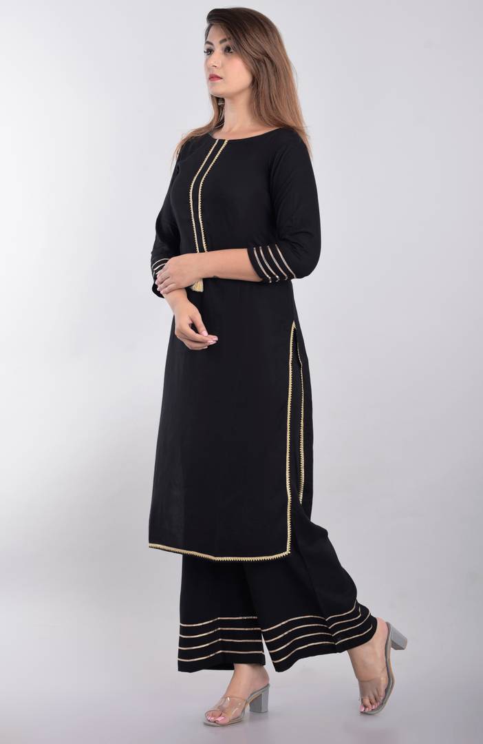 Alluring Black Rayon Gota Work Kurta Palazzo Set For Women