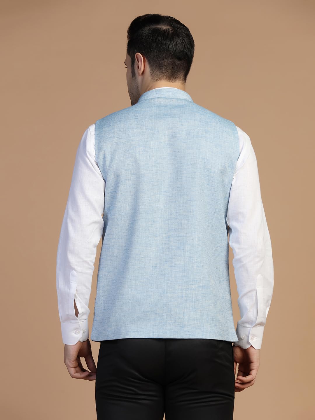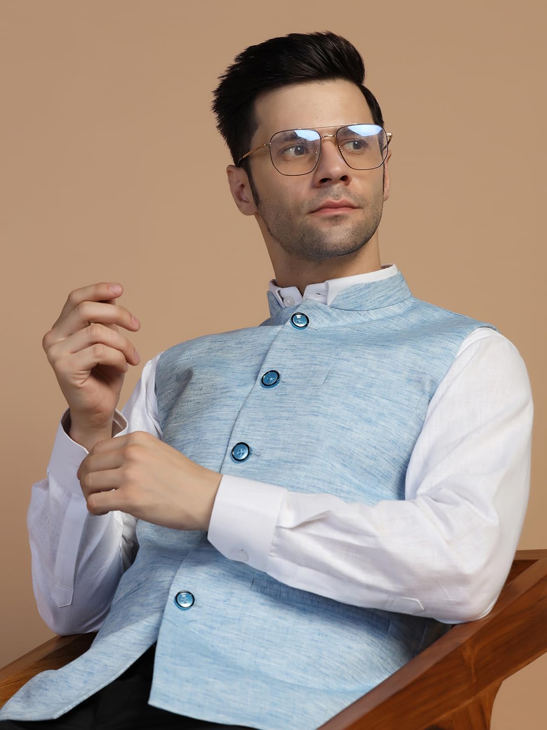 TAHVO Nehru-Modi Jacket Waistcoat for Men Linen Fabric Regular Fit Sleeveless Vest Sky Blue.