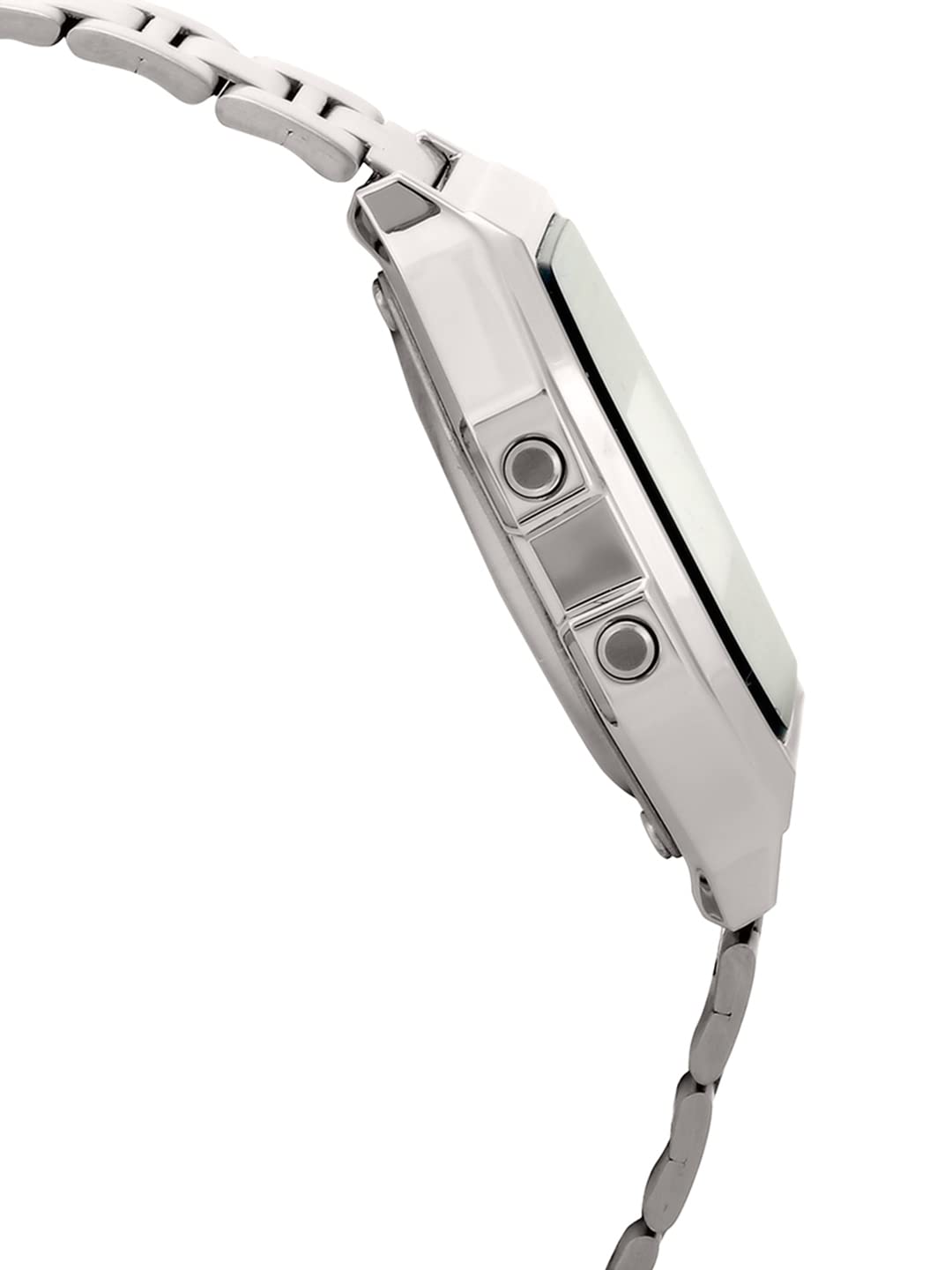 Resin Glass Water Resistant Case / bezel material: Resin / Chrome plated Stainless Steel Band Adjustable Buckle LED light 1/100-second stopwatch Measuring capacity: 59'59.99" Measuring modes: Net time, split time, 1st-2nd place times Daily alarm Hourly time signal Auto-calendar (28 days for February) 12/24-hour format Regular time keeping: Hour, minute, second, pm, date, day Accuracy: ±30 seconds per month Approx. battery life: 7 years on CR2016 and total weight: 48 g.