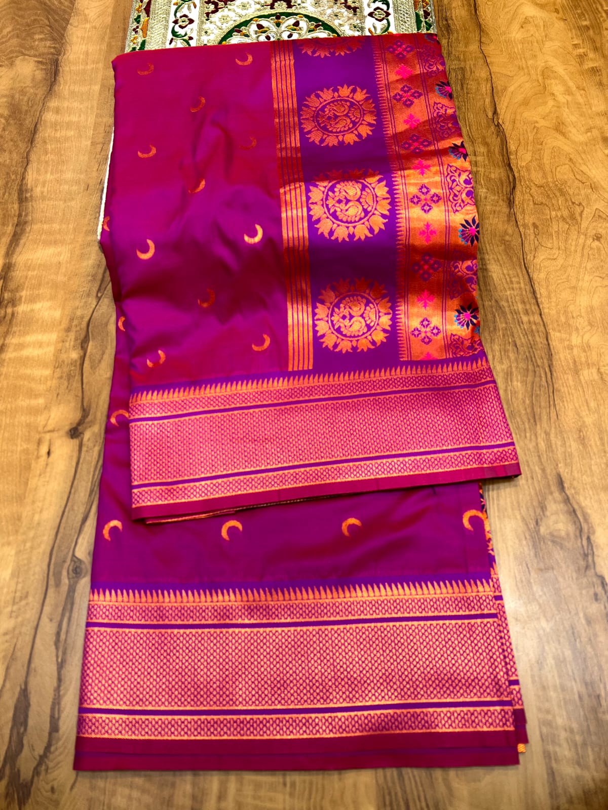 Experience the artistry of traditional Indian weaving with our Chandrakor Kadiyal Paithani saree. Adorned with beautifully woven Kadiyal Paithani buttis all over, this saree is a true reflection of craftsmanship. Comes with a matching blouse piece for a complete look.