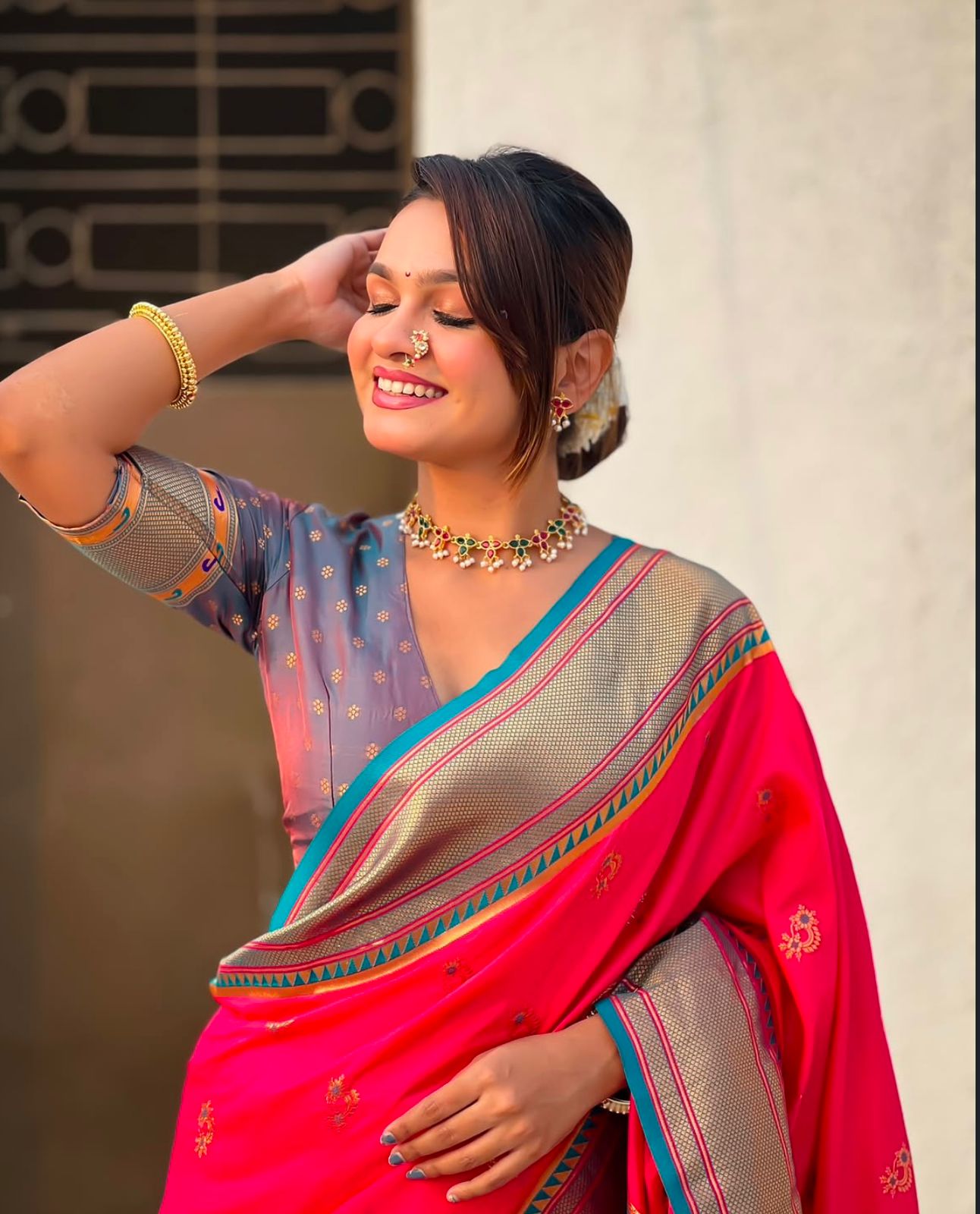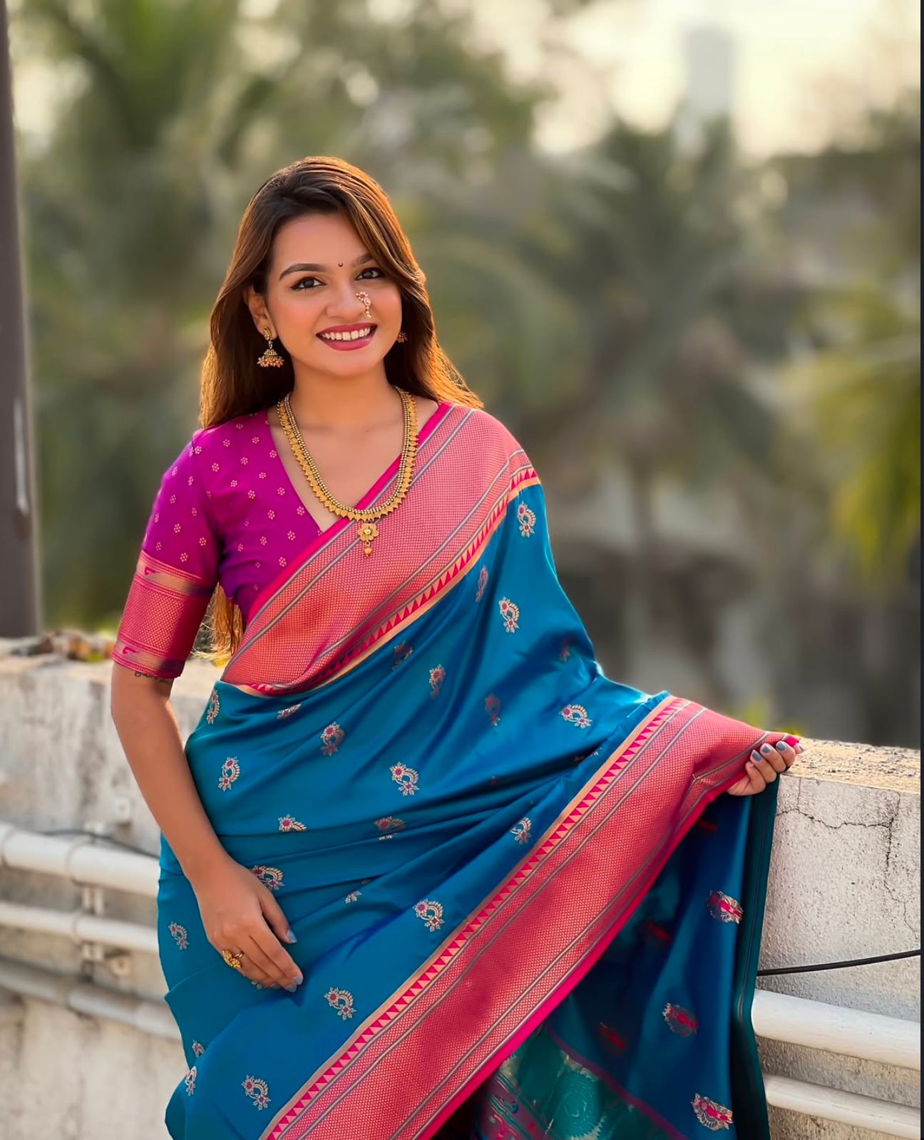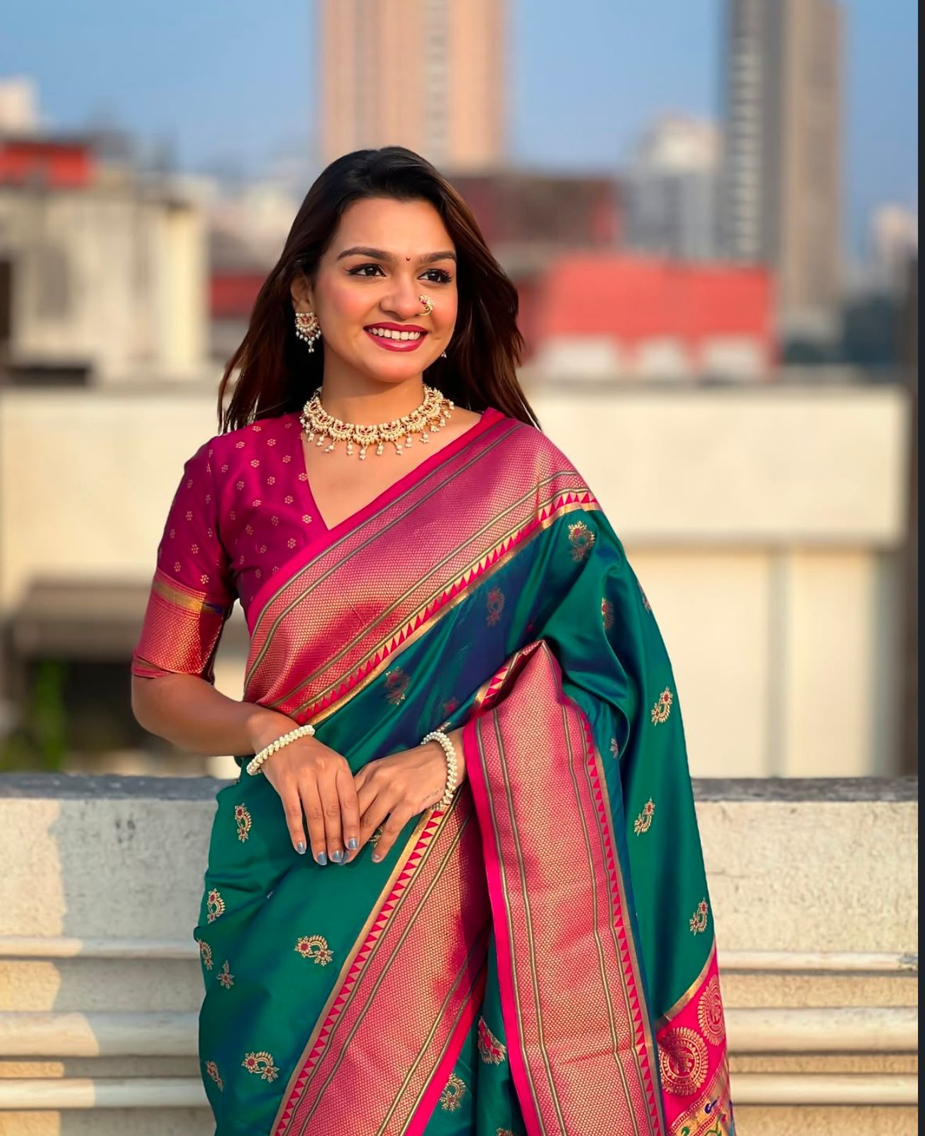 Immense Nath Kadiyal Paithani All Over Nath Buttis in Pure Katan Solf Silk Rich Pallu Contrast Blouse.