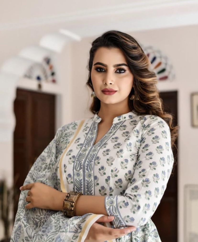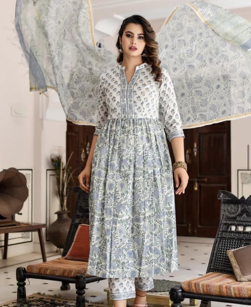 KLOSIA Women Block Printed Anarkali Kurta and Pant Set with Printed Dupatta (X-Large)