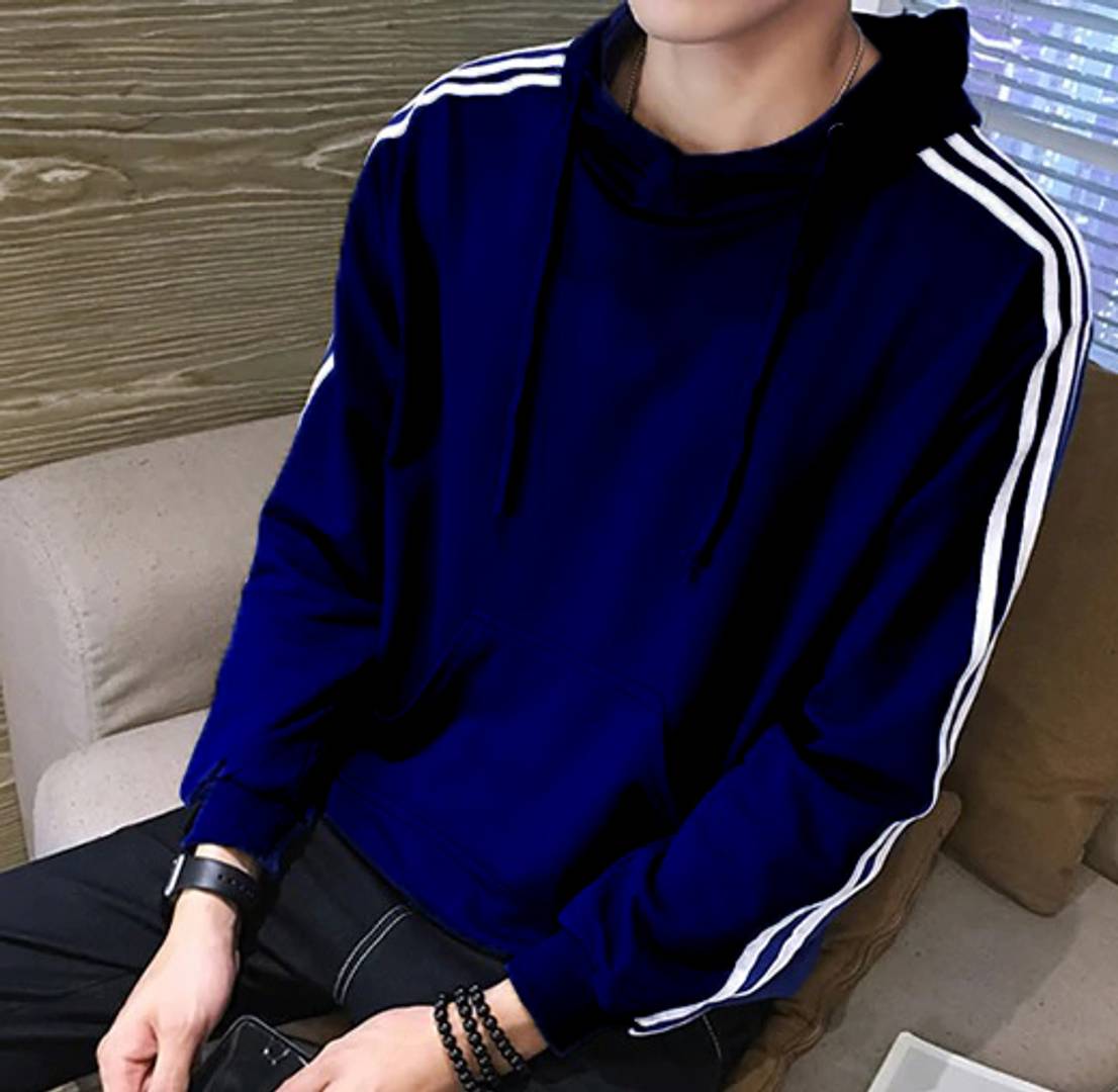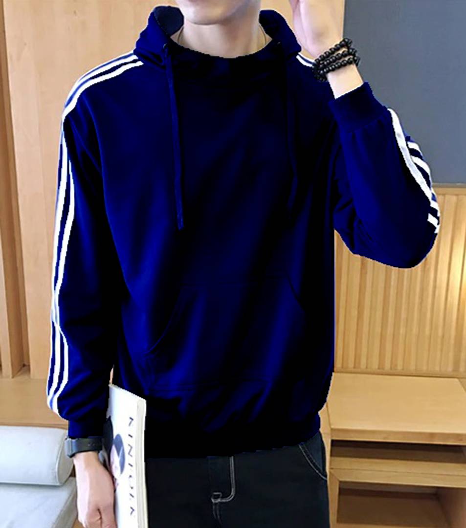 Men's Navy Blue Fleece Self Pattern Long Sleeves Regular Sports Hooded Sweatshirt
