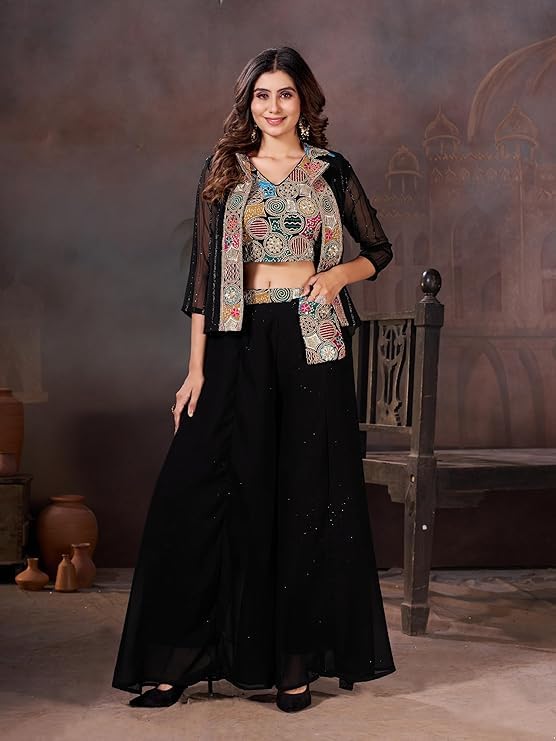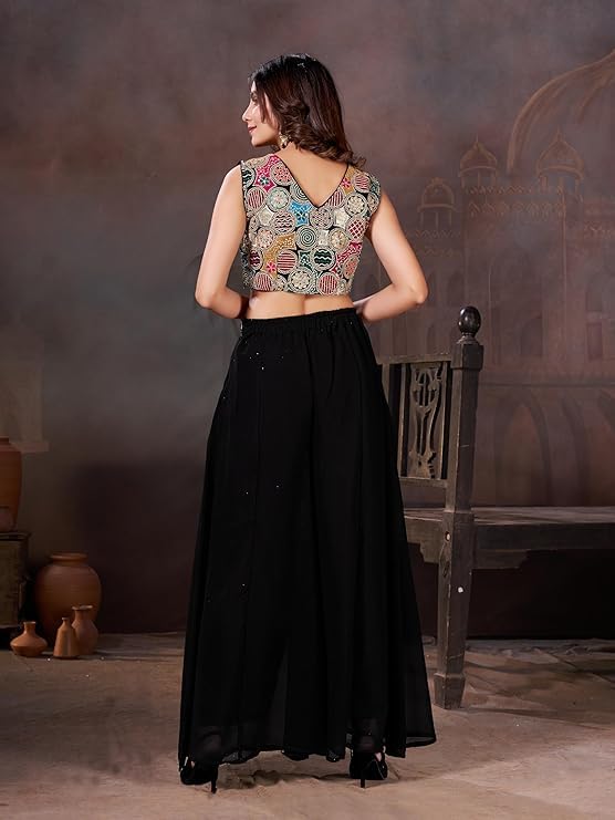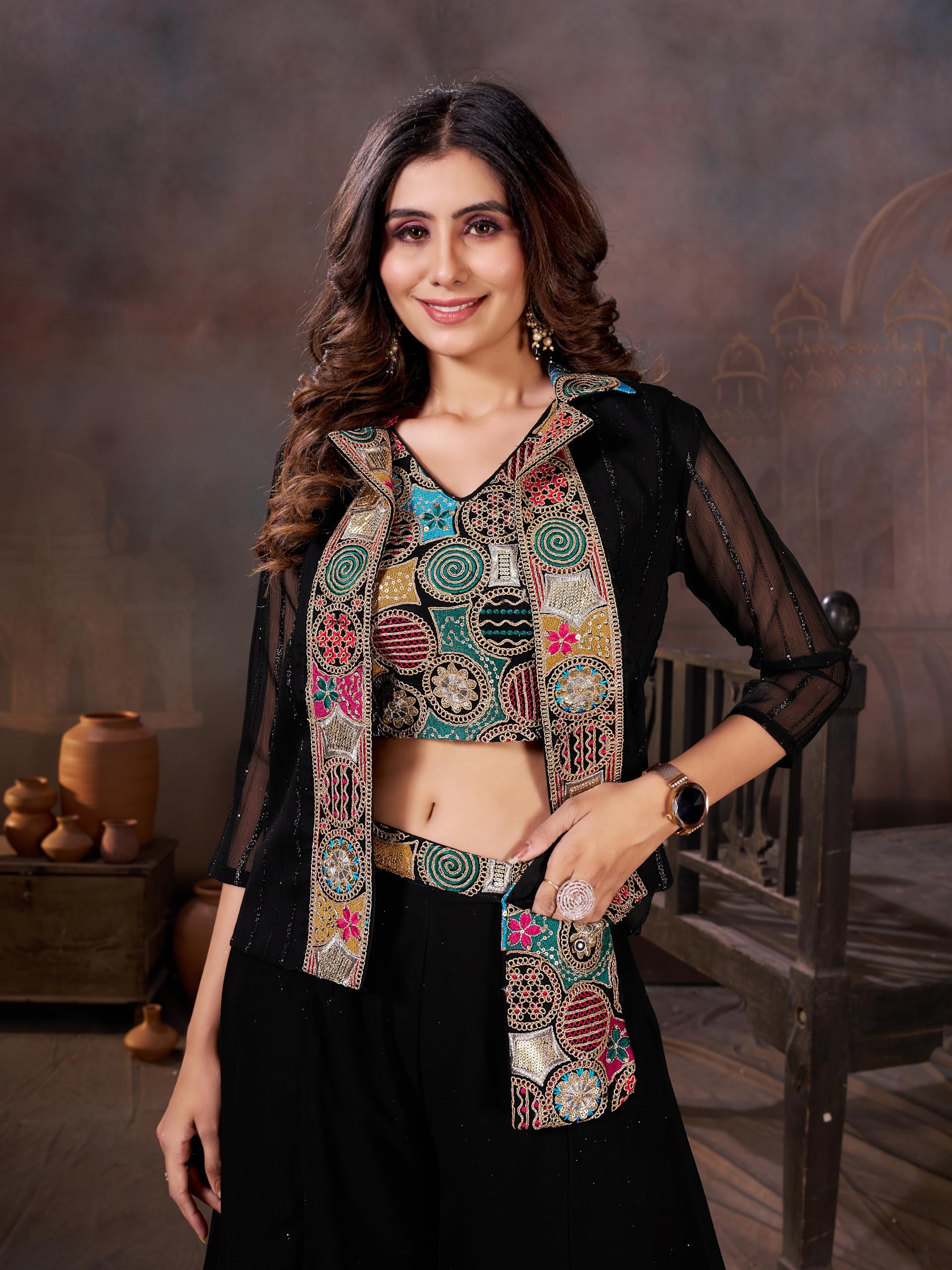 Women's readymade Black Indowestern lehenga choli with shrug.