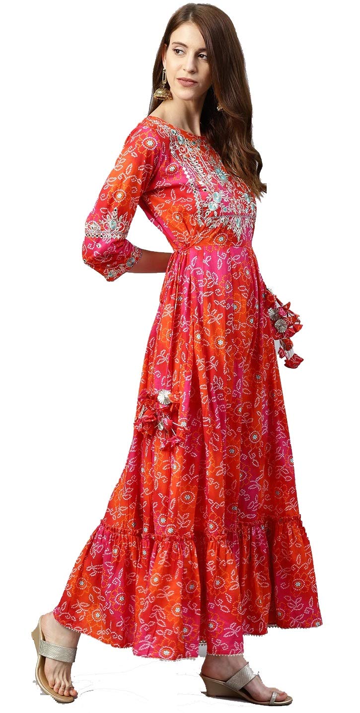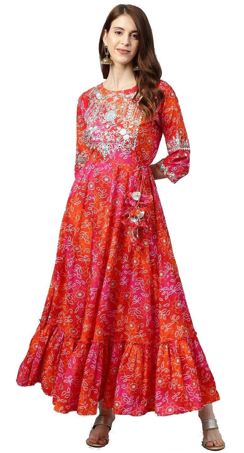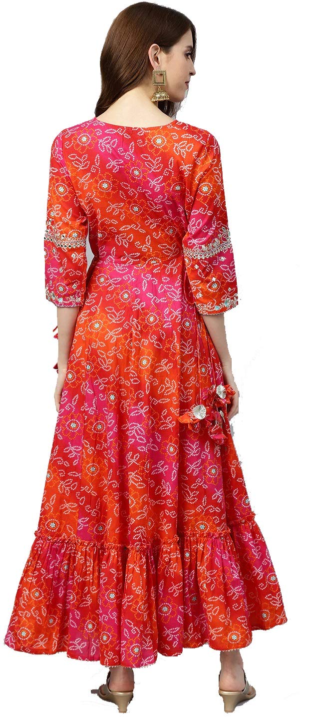 rytras Women's Cotton Printed Anarkali Embroidery Kurti(Red & Orange,M)