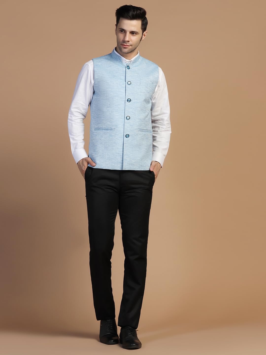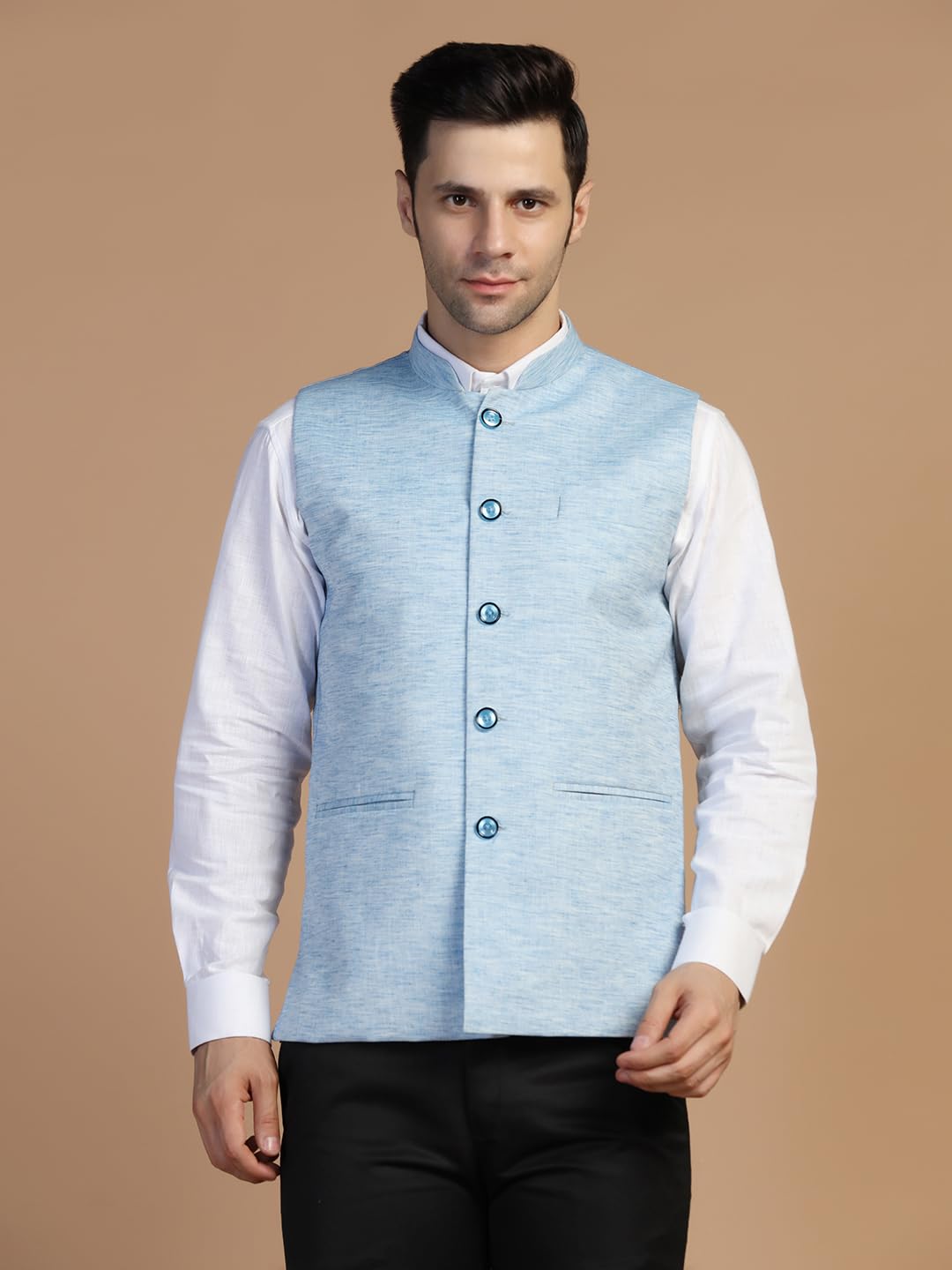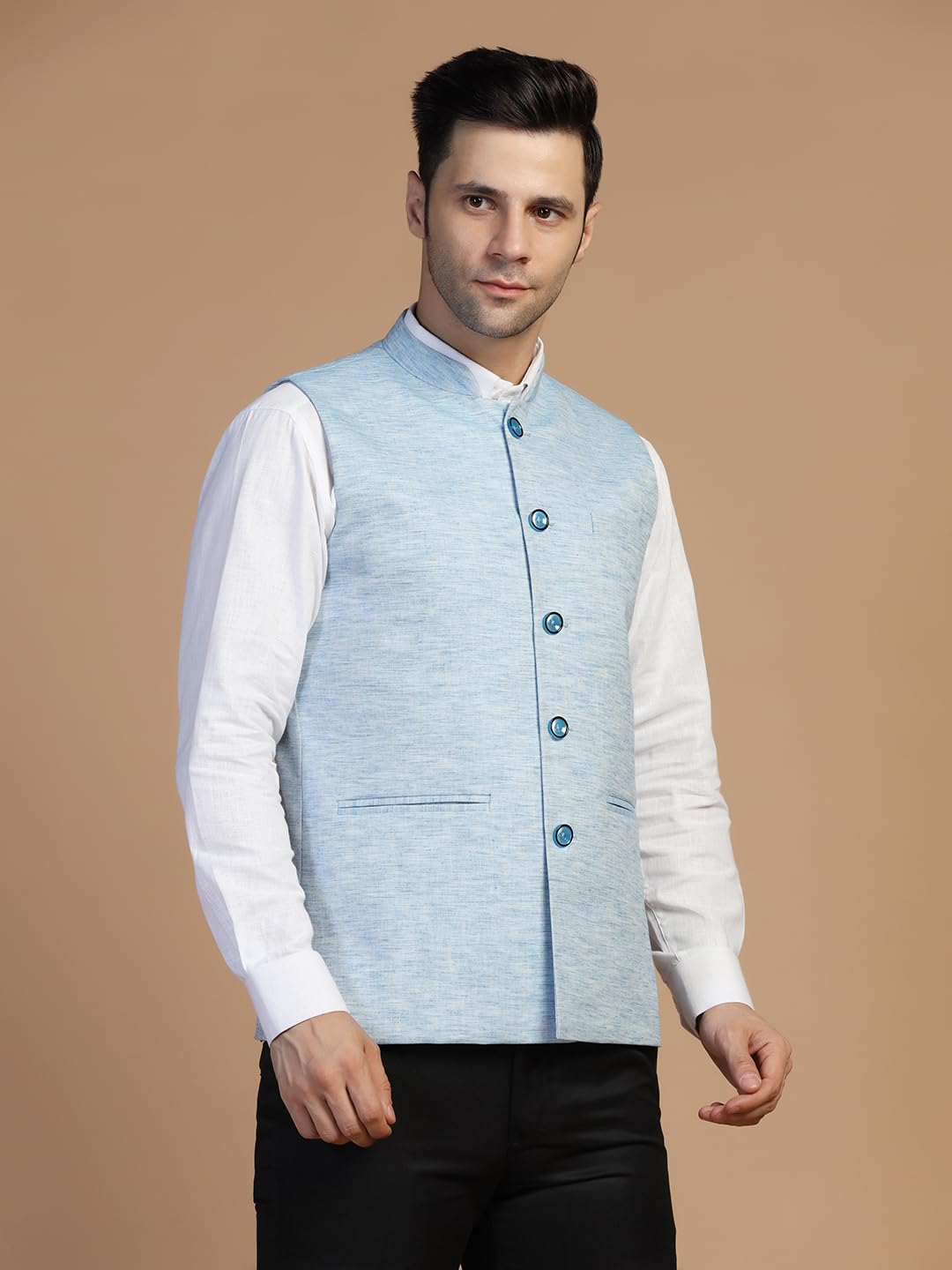 TAHVO Nehru-Modi Jacket Waistcoat for Men Linen Fabric Regular Fit Sleeveless Vest Sky Blue.