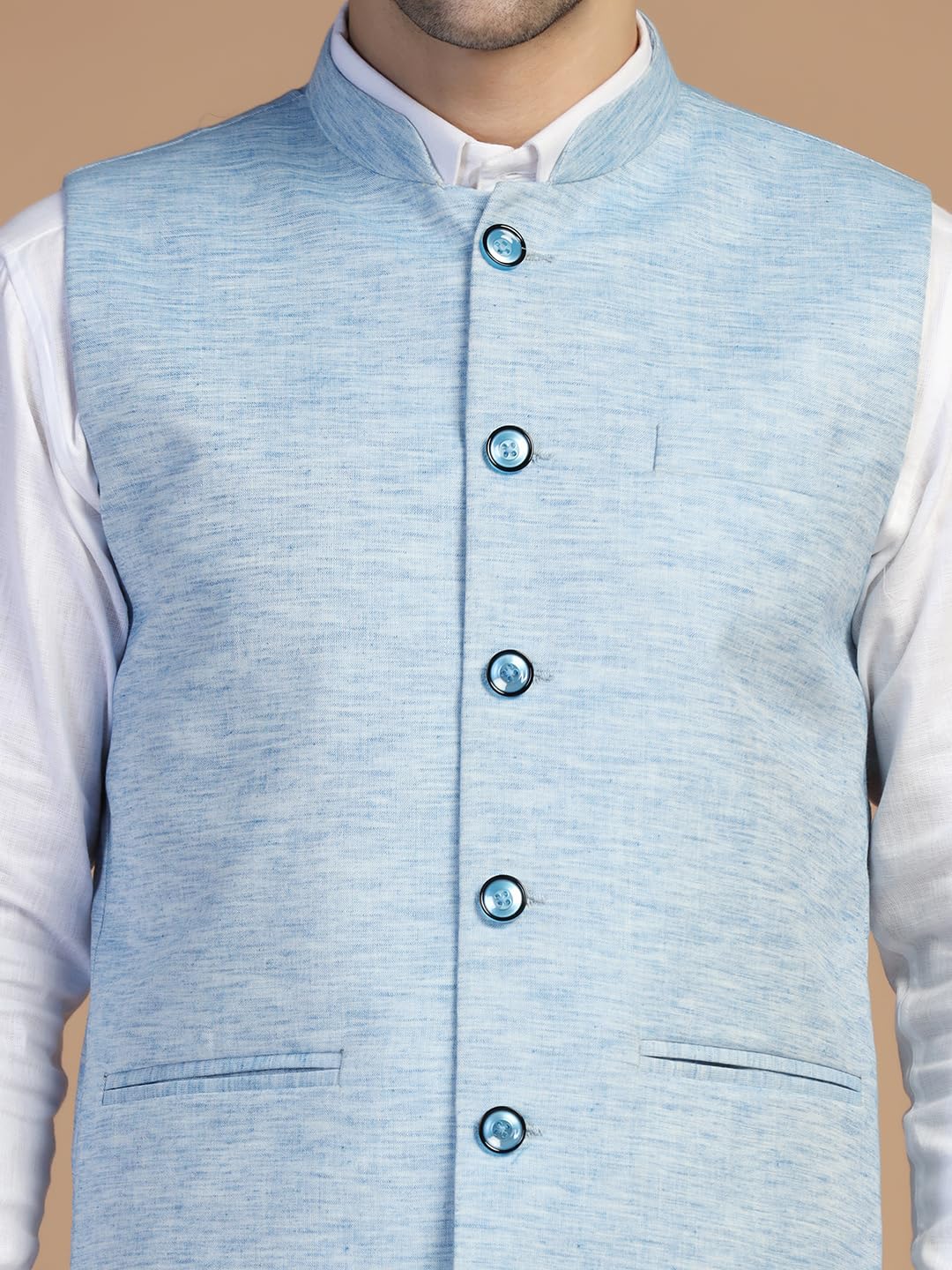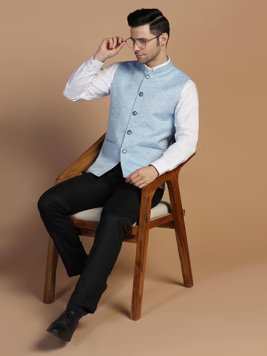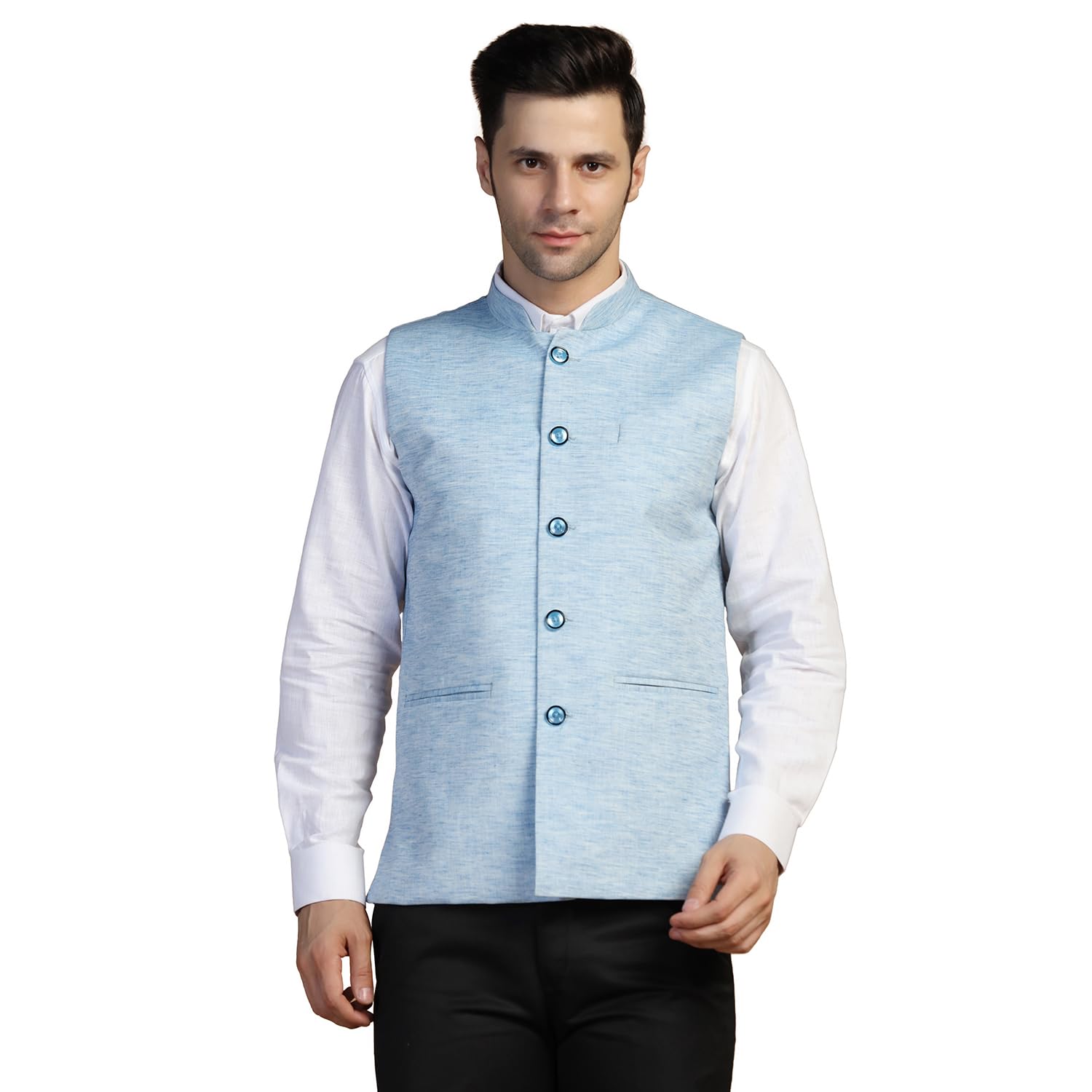 TAHVO Nehru-Modi Jacket Waistcoat for Men Linen Fabric Regular Fit Sleeveless Vest Sky Blue.