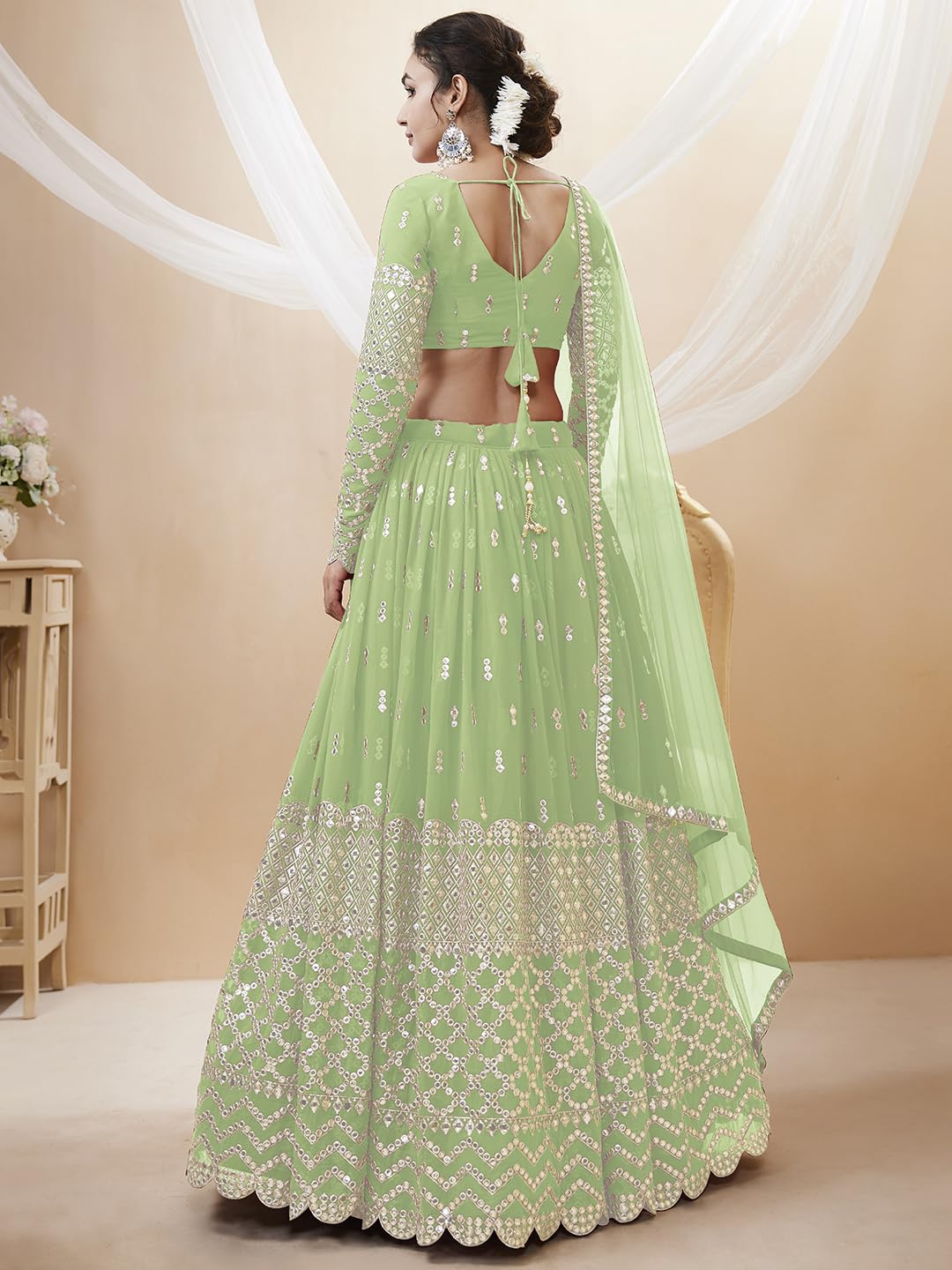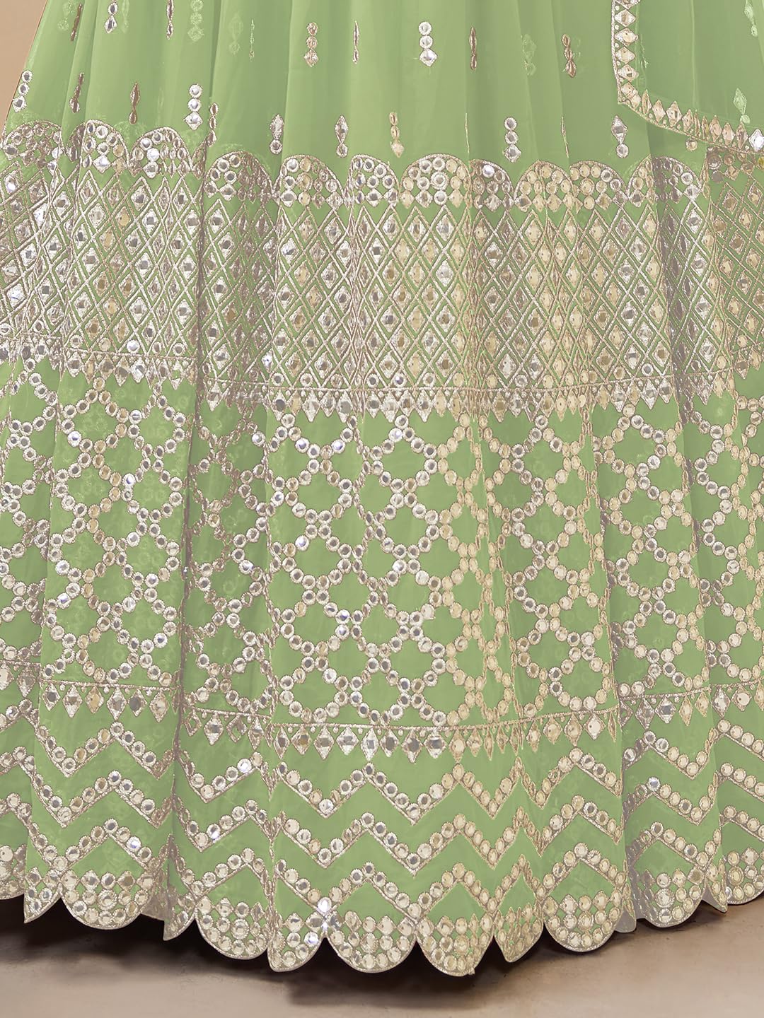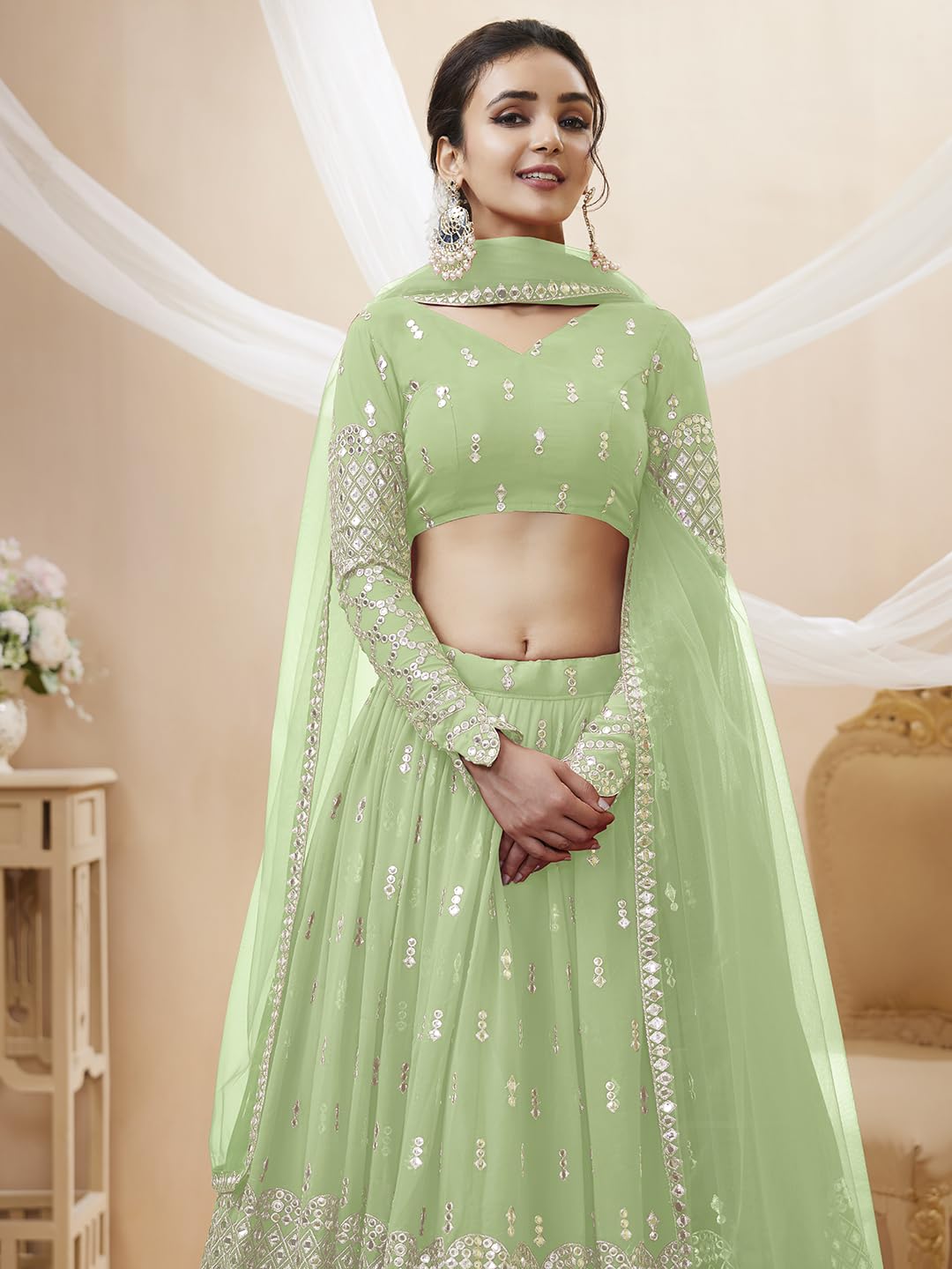 Women's Sequins Zari Embroidered Georgette Semi Stitched Lehenga Choli With Dupatta Free Size Pista